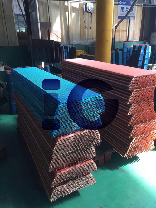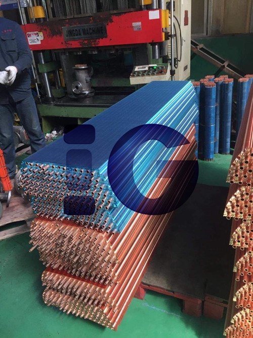 Photos took at our intercooler workshop that aluminum fins and copper fins stacked on the tubes awaiting the expansion.